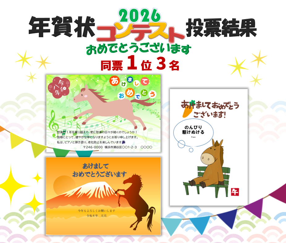 2026年2月5日 / 最終更新日時 : 2026年2月5日 delightcom 教育事業 ♡2026年 年賀状コンテスト受賞作品♡ 今年もパソコン教室の多くの受講生の皆さまにコンテストにご参加、投票していただきました! 他にも2位、ユニーク賞、佳作など… 入賞者には 賞品をプレゼントいたします♪